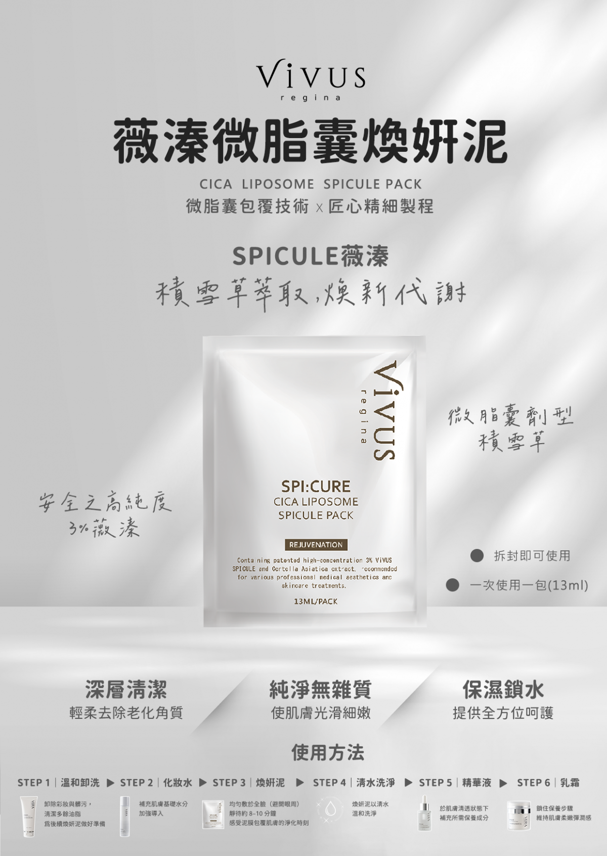 用途:含專利高濃度3%薇溱(ViVUS SPICULE)及積雪草萃取,推薦使用於各式專業醫美及護膚等療程。