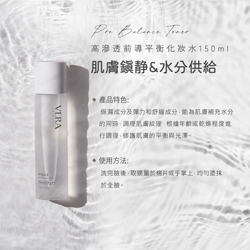 徹底清潔肌膚後,倒適量的化妝水於手心,輕柔塗抹至全臉。